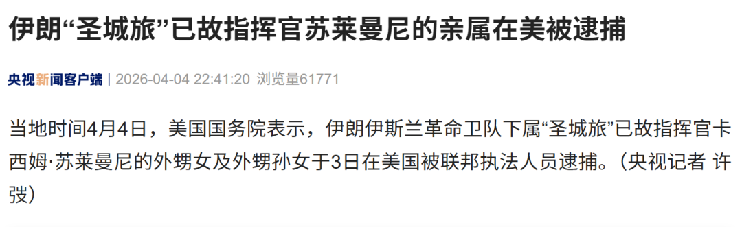当地时间4月4日,美国国务院表示,伊朗伊斯兰革命卫队下属“圣城旅”已故指挥官卡西姆·苏莱曼尼的外甥女及外甥孙女于3日在美国被联邦执法人员逮捕。