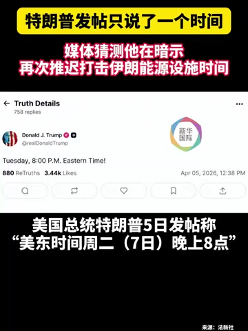 美国总统特朗普5日在社交媒体发文称,“美东时间周二(7日)晚上8点”。有媒体解读认为,这是他再次推迟为摧毁伊朗能源设施行动所设的最后时限,往后延迟一天。