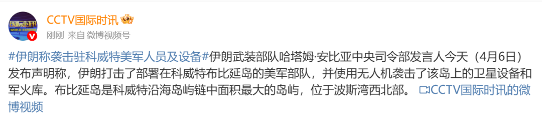 伊朗武装部队哈塔姆·安比亚中央司令部发言人今天(4月6日)发布声明称,伊朗打击了部署在科威特布比延岛的美军部队,并使用无人机袭击了该岛上的卫星设备和军火库。布比延岛是科威特沿海岛屿链中面积最大的岛屿,位于波斯湾西北部。