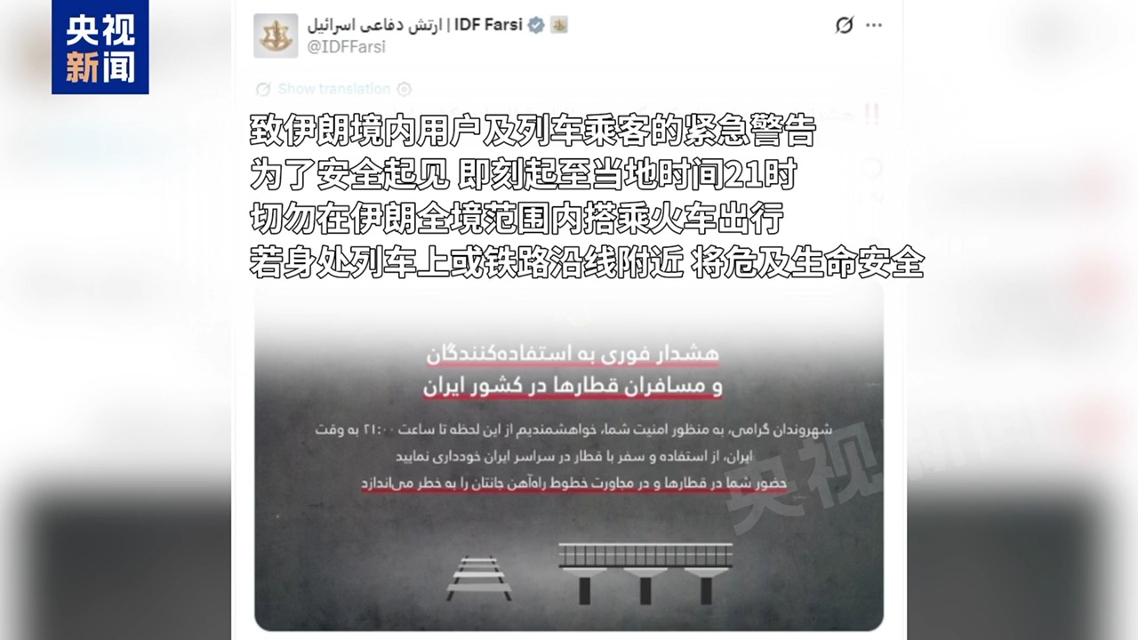 7日上午8时30分左右,以色列国防军波斯语发言人向伊朗民众发出一份特殊的警告,警告当地民众,即刻起至当天21时,不要乘坐火车或靠近铁路设施。以色列安全部门消息人士透露,以军将对伊朗的铁路相关设施发动打击,理由是伊朗的铁路系统被用于支持当前的军事行动,包括在全国范围内运输武器等军用物资。