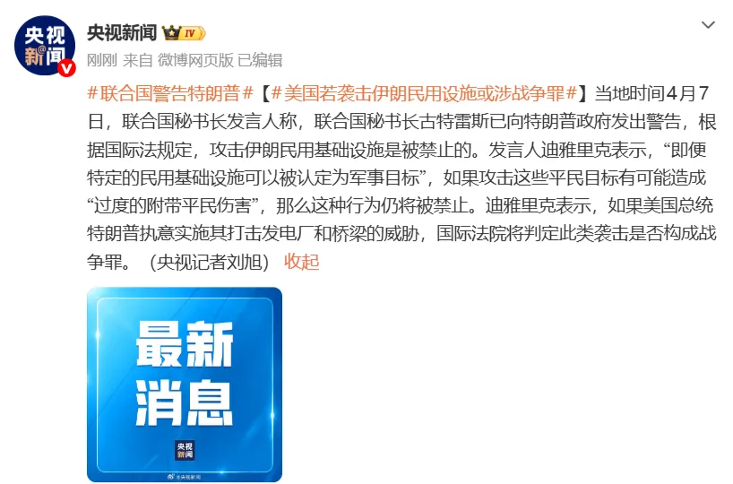 当地时间4月7日,联合国秘书长发言人称,联合国秘书长古特雷斯已向特朗普政府发出警告,根据国际法规定,攻击伊朗民用基础设施是被禁止的。