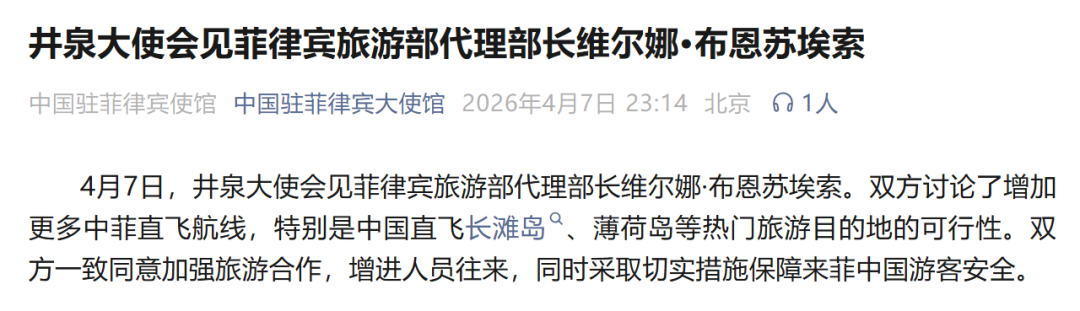 据“中国驻菲律宾大使馆”官微消息:4月7日,井泉大使会见菲律宾旅游部代理部长维尔娜·布恩苏埃索。双方讨论了增加更多中菲直飞航线,特别是中国直飞长滩岛、薄荷岛等热门旅游目的地的可行性。双方一致同意加强旅游合作,增进人员往来,同时采取切实措施保障来菲中国游客安全。