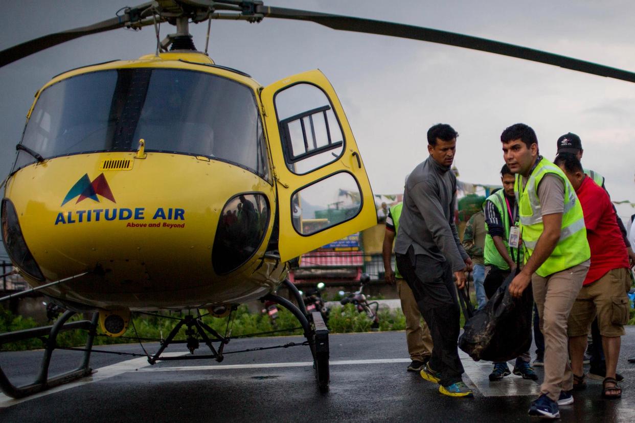 2023年7月11日,载有坠机事件遇难者遗体的直升机抵达尼泊尔加德满都。新华社发(苏拉韦·什雷斯塔摄)
