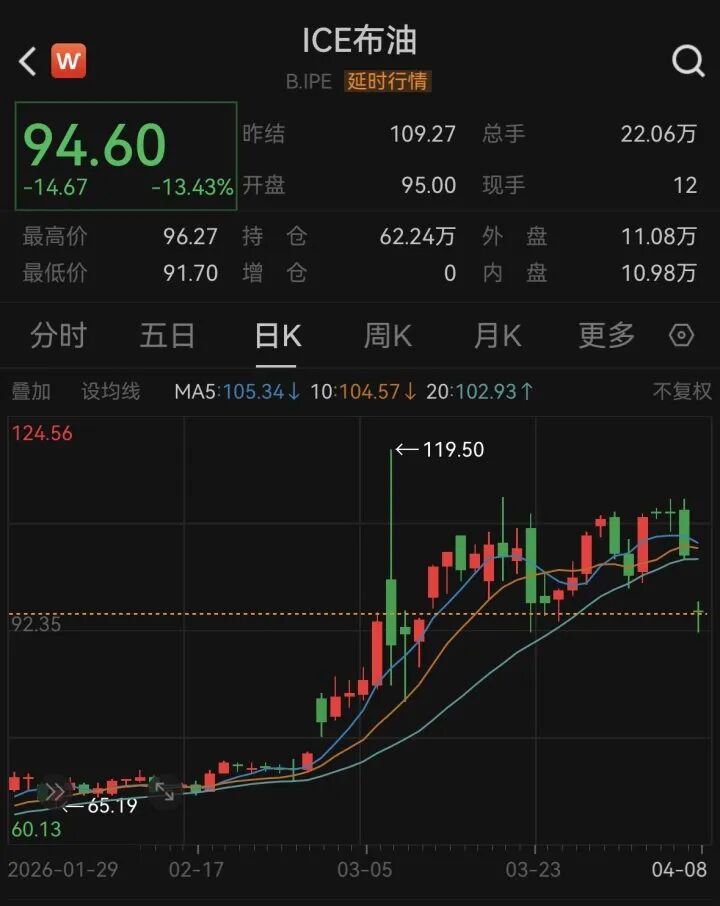7日晚间,纽约商品交易所5月交货的轻质原油期货价格一度跌至每桶91.03美元,相比当天早些时候的收盘价下跌21.92美元,跌幅达19.4%;6月交货的伦敦布伦特原油期货价格一度跌至每桶91.7美元,相比当天早些时候的收盘价下跌17.57美元,跌幅达16%。随后,纽约和伦敦布伦特原油期价均有所反弹,目前暂时在每桶95美元附近盘整。