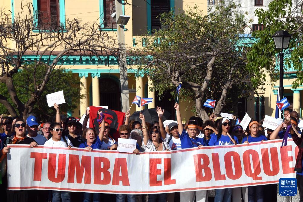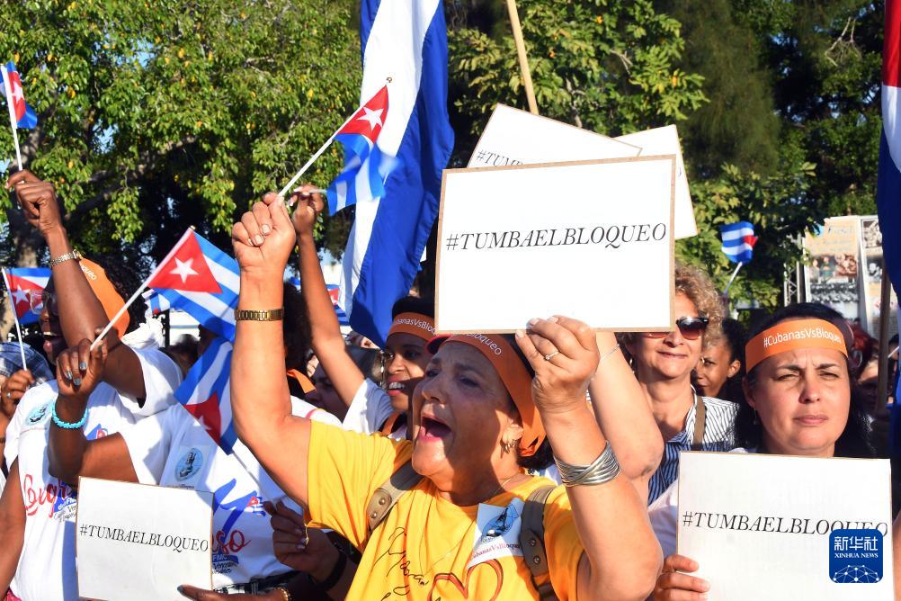 4月7日,在古巴首都哈瓦那,妇女们在集会现场手持“推翻封锁”的横幅和古巴国旗,谴责美国对古封锁。新华社发(华金·埃尔南德斯摄)