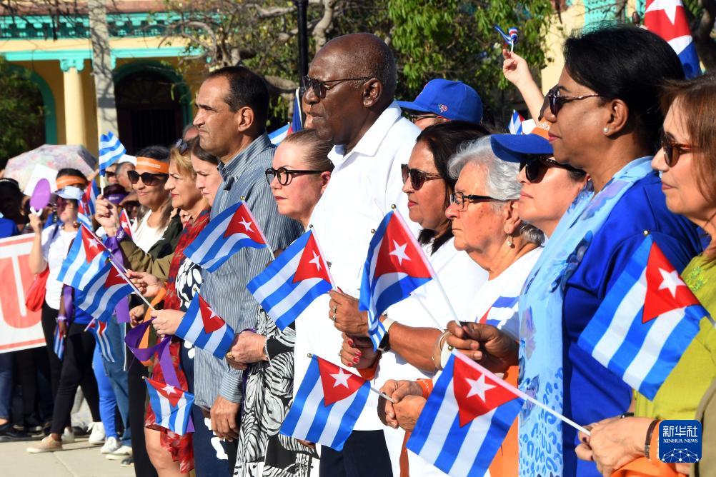 本次集会由古巴妇女联合会发起。现场民众聚集在公园中央,挥舞古巴国旗,高举写有“推翻封锁”的标语。古巴国家副主席萨尔瓦多·梅萨以及其他古巴党政机关和群众组织代表出席活动。