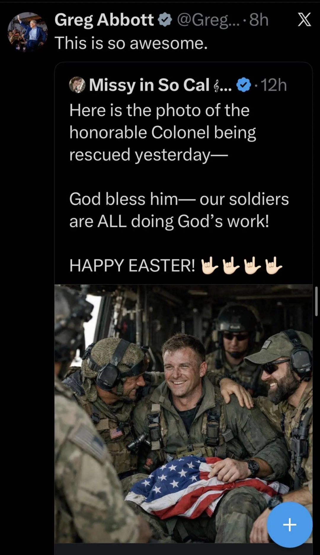 在特朗普宣布成功营救消息后仅几小时,社交平台X上流传一张美国大兵手捧星条旗的照片,配文称“这是昨天获救的英勇上校的照片”。首发图片获得了超过500万次浏览,随后被得州州长格雷格·阿博特、得州总检察长肯·帕克斯顿、纽约州众议员迈克·劳勒等多名共和党人转发。阿博特写道:“这太棒了”,劳勒则发帖称:“上帝保佑美国!”
