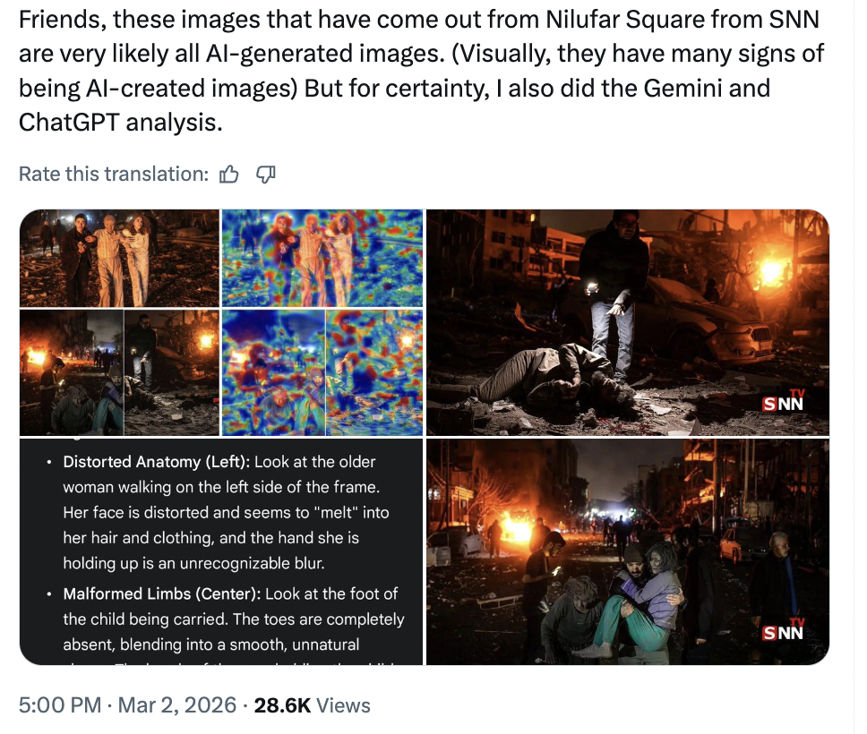 在空袭现场图像在网上流传后不久,X平台上一名自称视觉效果师的用户发布了所谓的“热力图叠加层”以及来自Gemini和ChatGPT的输出结果,声称这些照片“极有可能全是AI生成的图像”。这些可视化图表迅速传播,并被当作图像造假的证据。