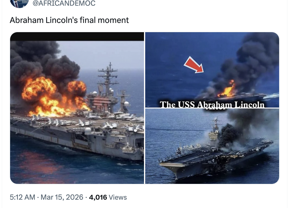 3月1日,伊朗伊斯兰革命卫队发布7号公告,称美国“亚伯拉罕·林肯”号航空母舰遭到伊朗四枚弹道导弹袭击。这在社交平台上引发了大量AI生成的虚假视频传播,大多描绘了舰艇在火焰中燃烧的画面,并配以各种语言传播。