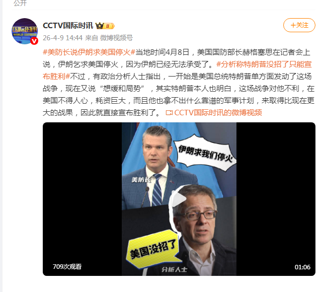当地时间4月8日,美国国防部长赫格塞思在记者会上说,伊朗乞求美国停火,因为伊朗已经无法承受了。
