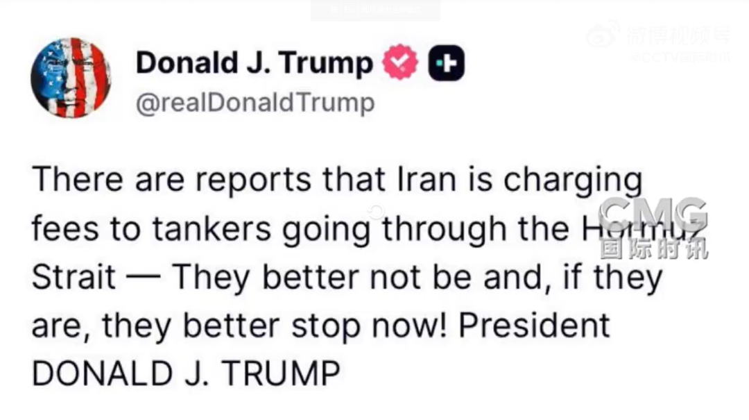 特朗普发文称:“有报道说伊朗正在对途经霍尔木兹海峡的油轮收取费用,他们最好别这么做,如果确实在这么做,最好现在就停止。”他在随后的帖文中指责伊朗目前的做法,称“那不是我们达成的协议”。