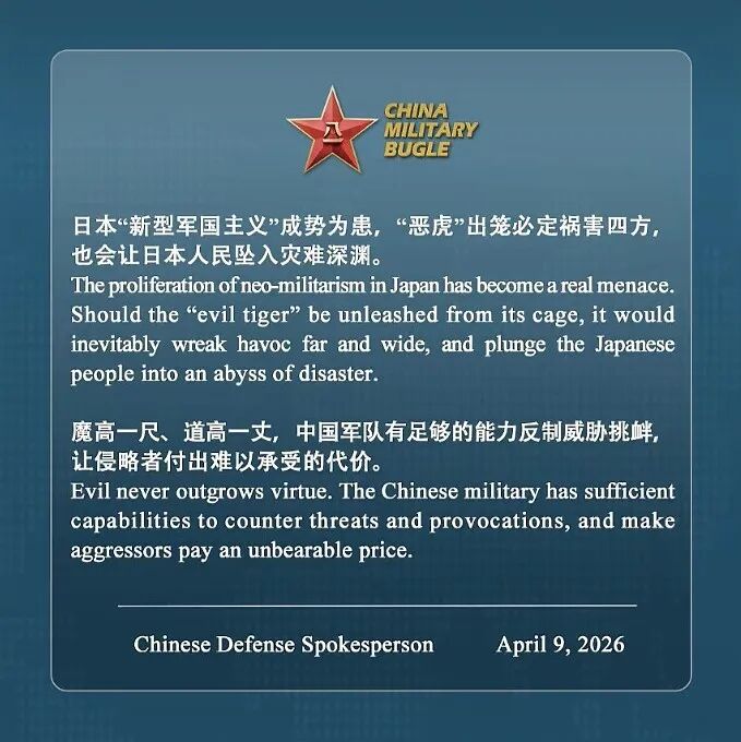 据中国新闻网,4月9日,中国军号海外账号发布中日英海报: