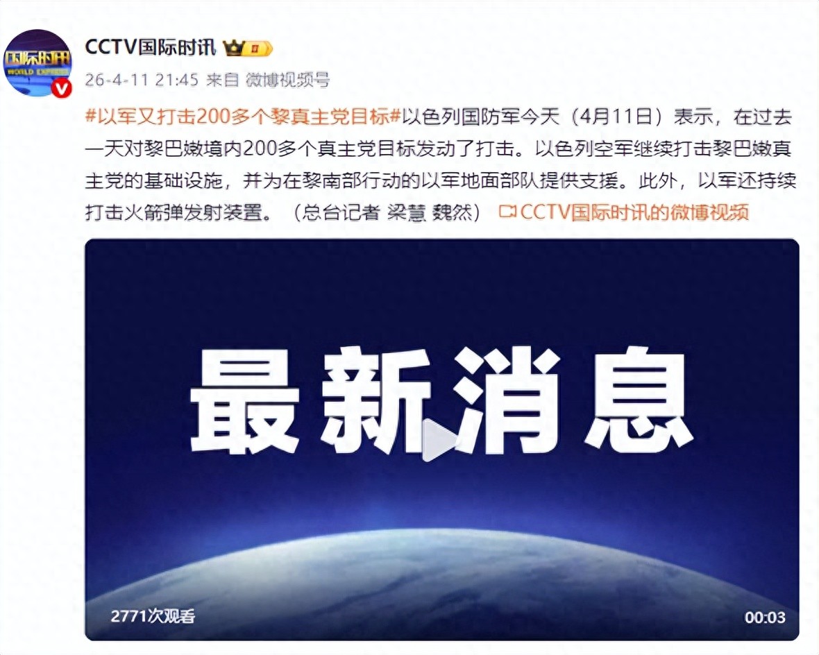 以色列国防军今天(4月11日)表示,在过去一天对黎巴嫩境内200多个真主党目标发动了打击。以色列空军继续打击黎巴嫩真主党的基础设施,并为在黎南部行动的以军地面部队提供支援。此外,以军还持续打击火箭弹发射装置。(总台记者 梁慧 魏然)