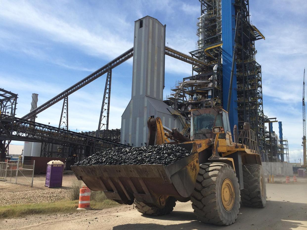2016年10月25日,在美国得克萨斯州科珀斯克里斯蒂的奥钢联集团海绵铁生产工厂,车辆装载运输海绵铁。新华社记者张永兴摄