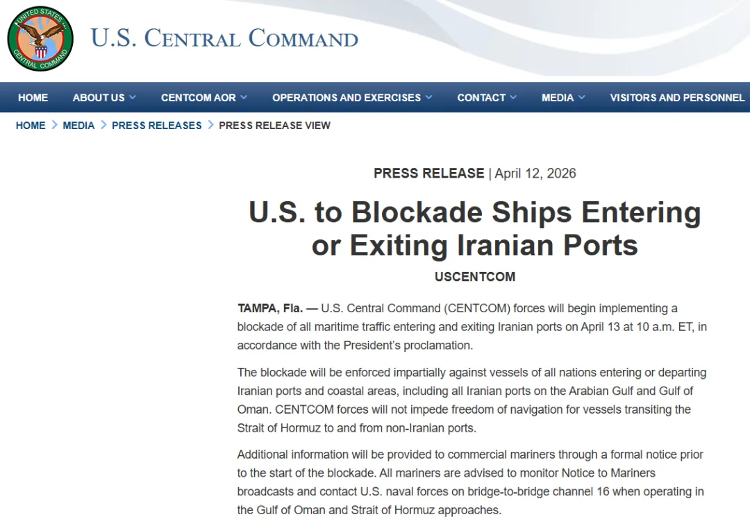 美军中央司令部表示,将根据总统命令于美国东部时间13日10时开始对所有进出伊朗港口的海上交通实施封锁。