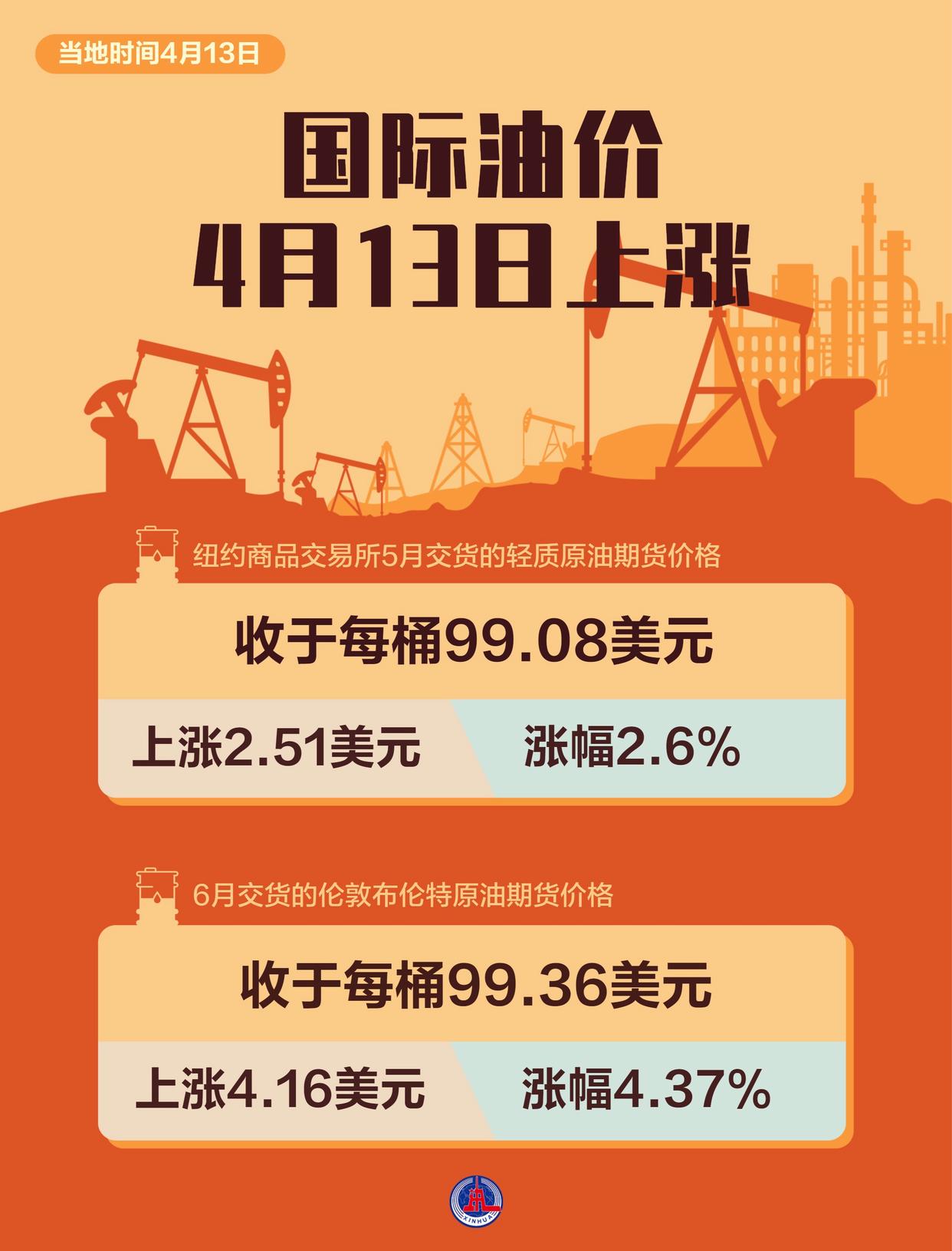 截至当地时间4月13日收盘,纽约商品交易所5月交货的轻质原油期货价格上涨2.51美元,收于每桶99.08美元,涨幅为2.6%;6月交货的伦敦布伦特原油期货价格上涨4.16美元,收于每桶99.36美元,涨幅为4.37%。