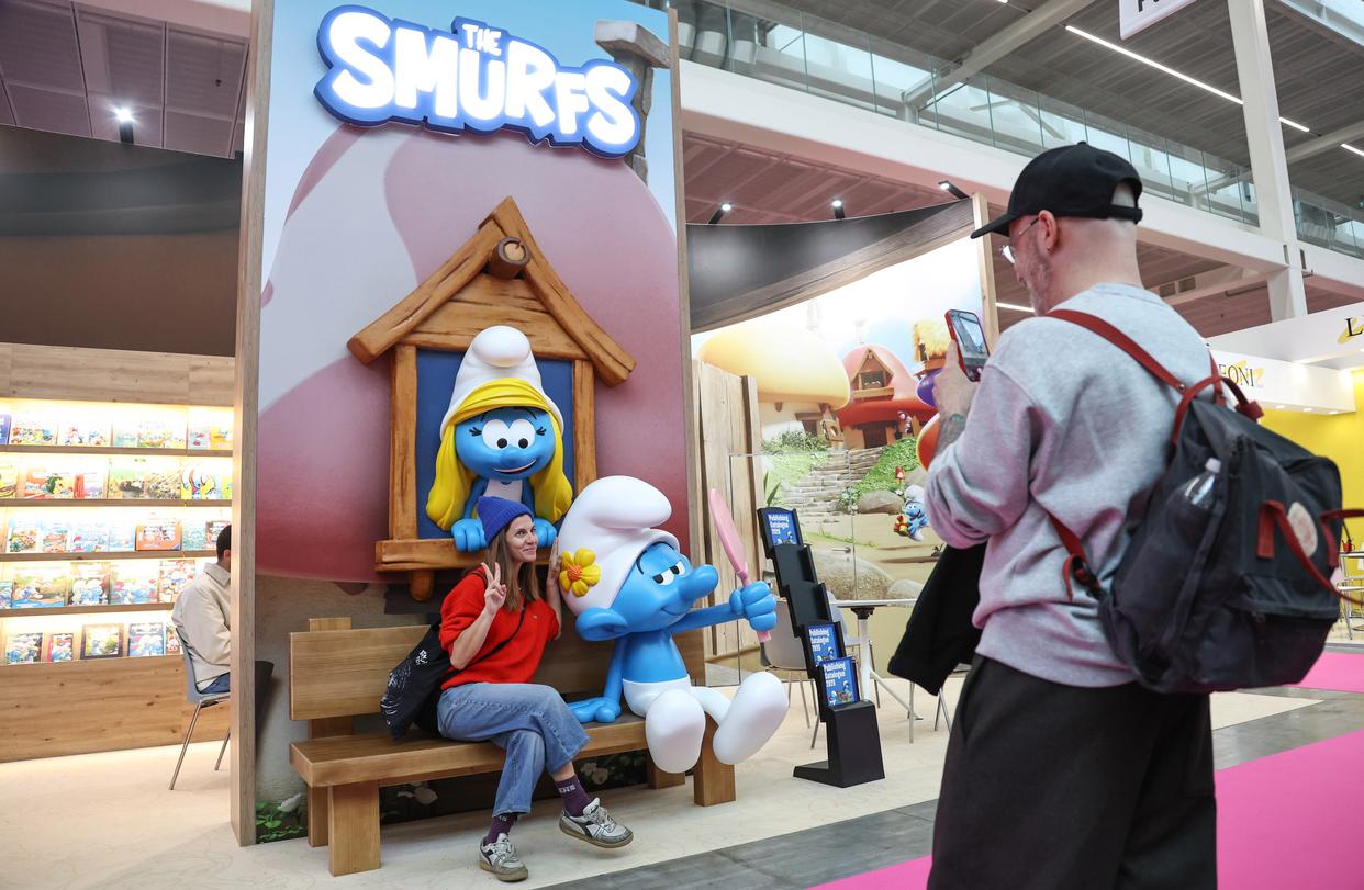 4月13日,在意大利博洛尼亚举行的博洛尼亚国际童书展上,观众与“蓝精灵”卡通形象合影。新华社记者 王楷焱 摄