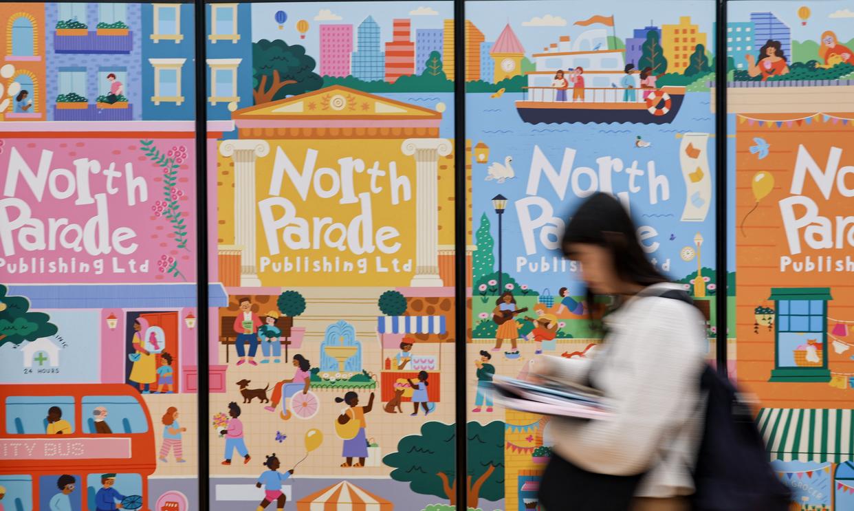4月13日,在意大利博洛尼亚举行的博洛尼亚国际童书展上,观众从展会主题海报前走过。新华社记者 王楷焱 摄