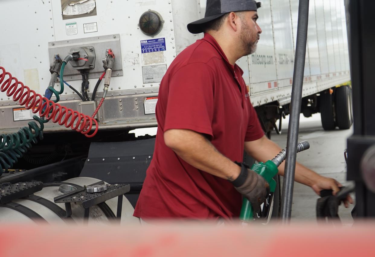 3月31日,在美国加利福尼亚州蒙罗维亚市的一座加油站,司机为卡车加油。新华社发(曾慧摄)