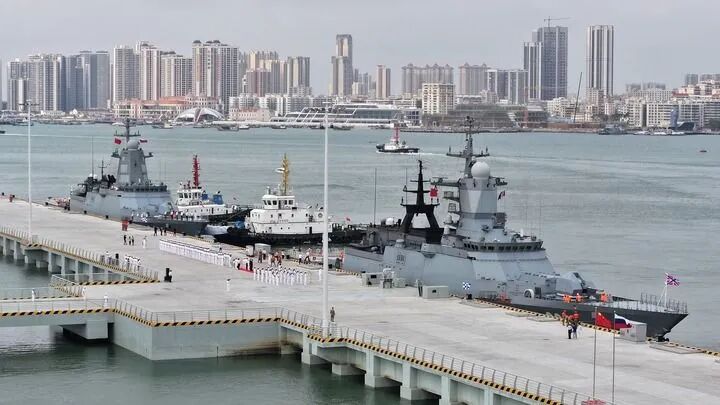 上午9时许,在中国海军郴州舰引导下,悬挂中俄两国国旗的俄海军舰艇编队,缓缓靠泊湛江某军港码头。中方在码头举行了欢迎仪式。
