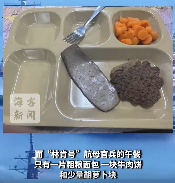据今日美国新闻网报道,近日,美国海军“林肯号”航母以及"的黎波里号”两栖攻击舰舰上伙食曝光引发热议。舰上官兵发布的图片显示,“的黎波里号”船员午餐只有一勺碎牛肉和两块玉米饼,而“林肯号”航母官兵的午餐只有一片粗粮面包、一块牛肉饼和少量胡萝卜块。