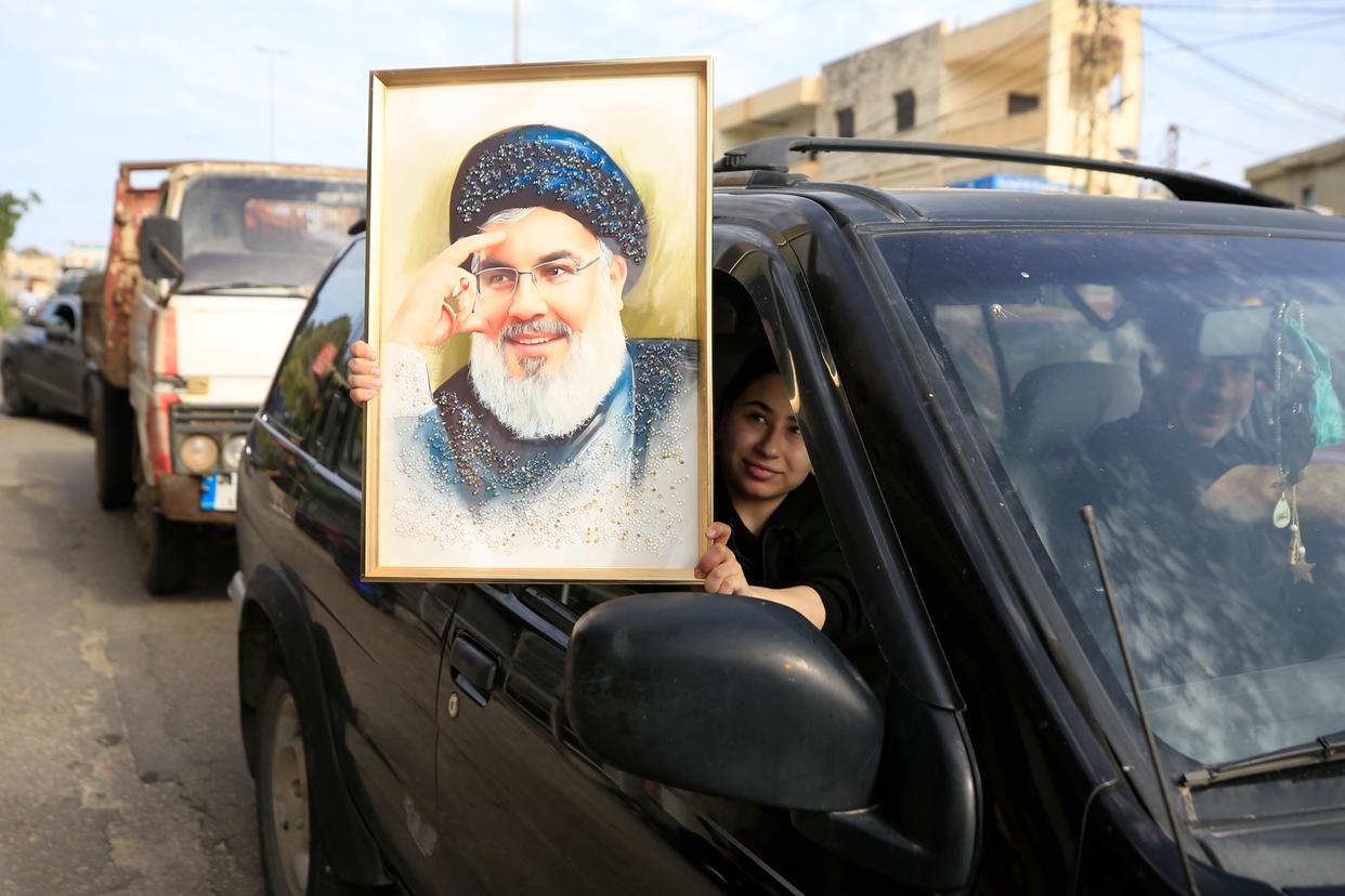 2026年4月17日,在黎巴嫩南部加西米耶,民众在停火生效后举着已故真主党领导人纳斯鲁拉的画像返回家园。新华社发(阿里·哈希绍摄)