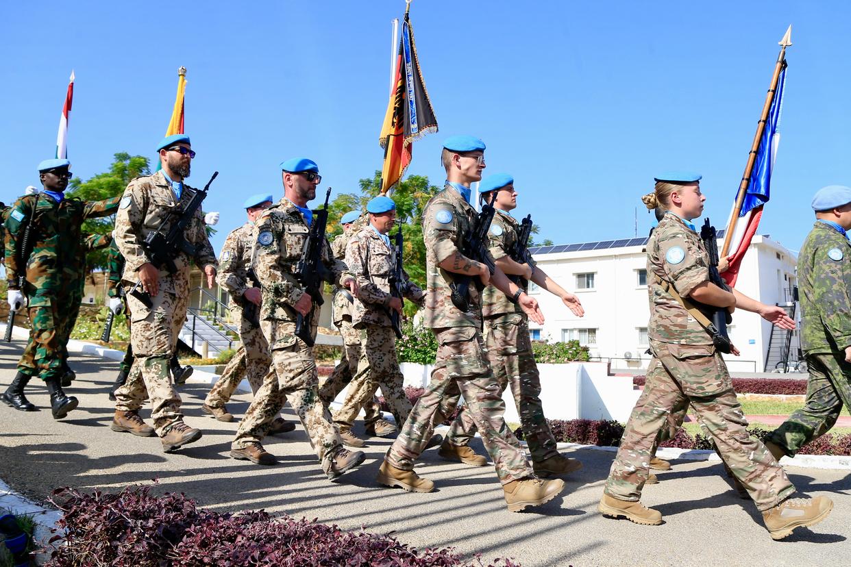 2025年10月24日,联合国驻黎巴嫩临时部队(联黎部队)在其位于黎南部纳古拉镇的总部举行仪式,纪念联合国成立80周年。新华社发(阿里·哈希绍摄)