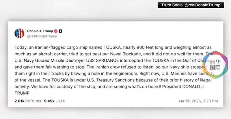 据新华社:美东时间19日下午,美国总统特朗普在社媒发文,称美军当天在阿曼湾武力拦截并控制一艘试图突破美军海上封锁的伊朗货船。美军中央司令部随后发布文字声明和视频,称美军导弹驱逐舰“斯普鲁恩斯”号当天拦截穿过北阿拉伯海、准备前往伊朗阿巴斯港的伊朗货船“Touska”号,用舰炮向其机舱开火,使其失去推进动力。美海军陆战队员随后登上并控制这艘货船。