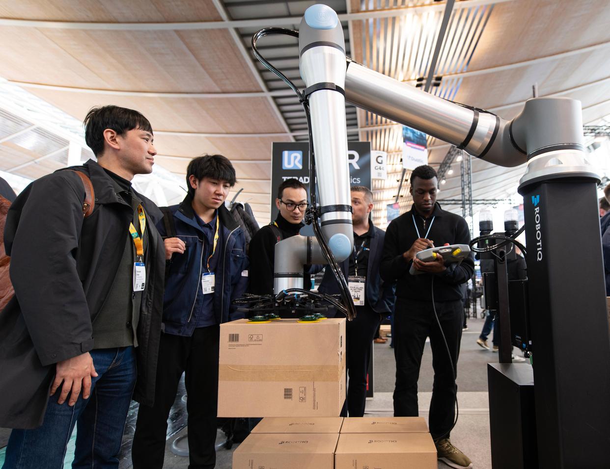 4月20日,人们在德国汉诺威工业博览会参观一款机械臂。新华社记者 张豪夫 摄