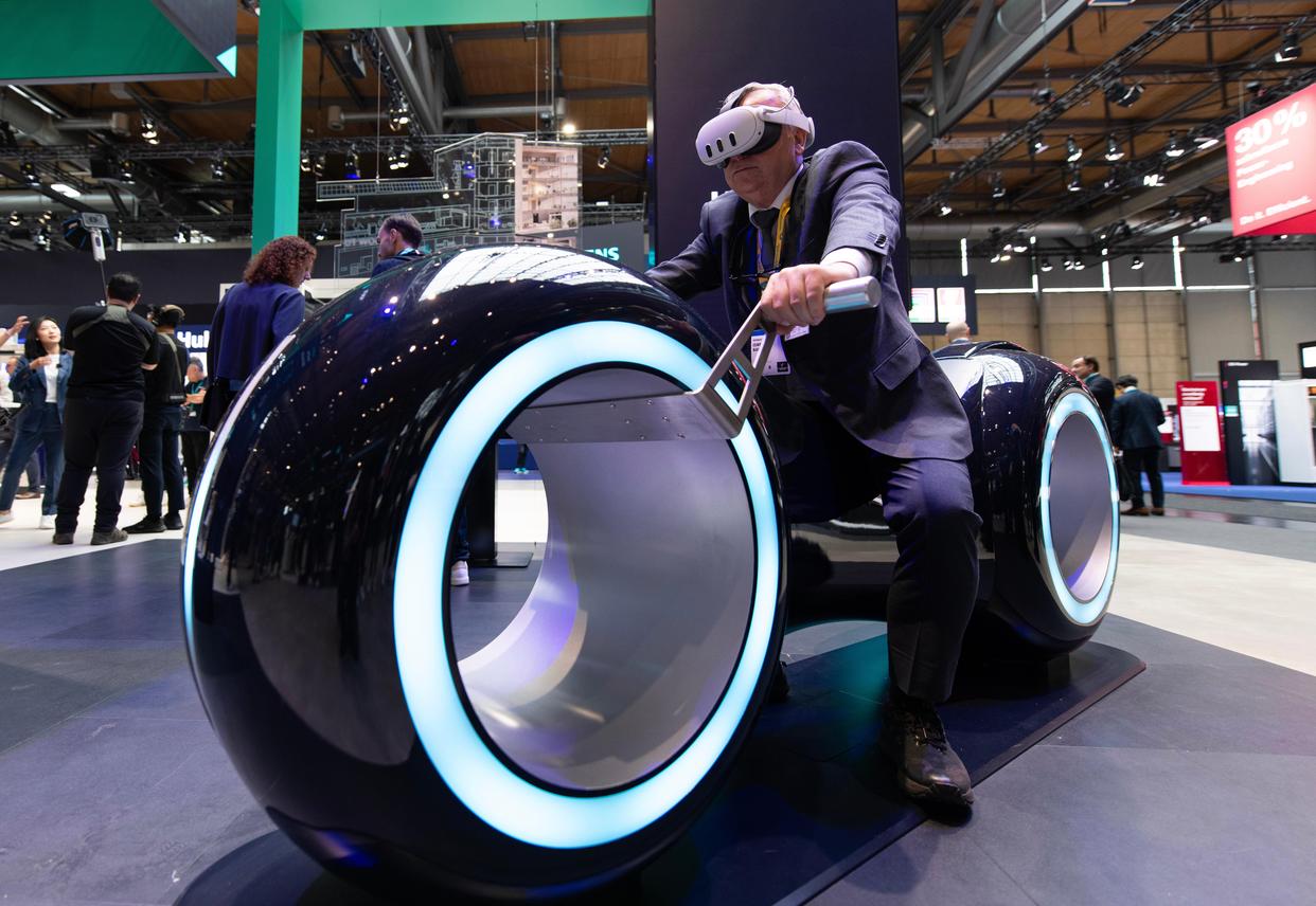 4月20日,一名男子在德国汉诺威工业博览会西门子展区体验一款VR设备。新华社记者 张豪夫 摄