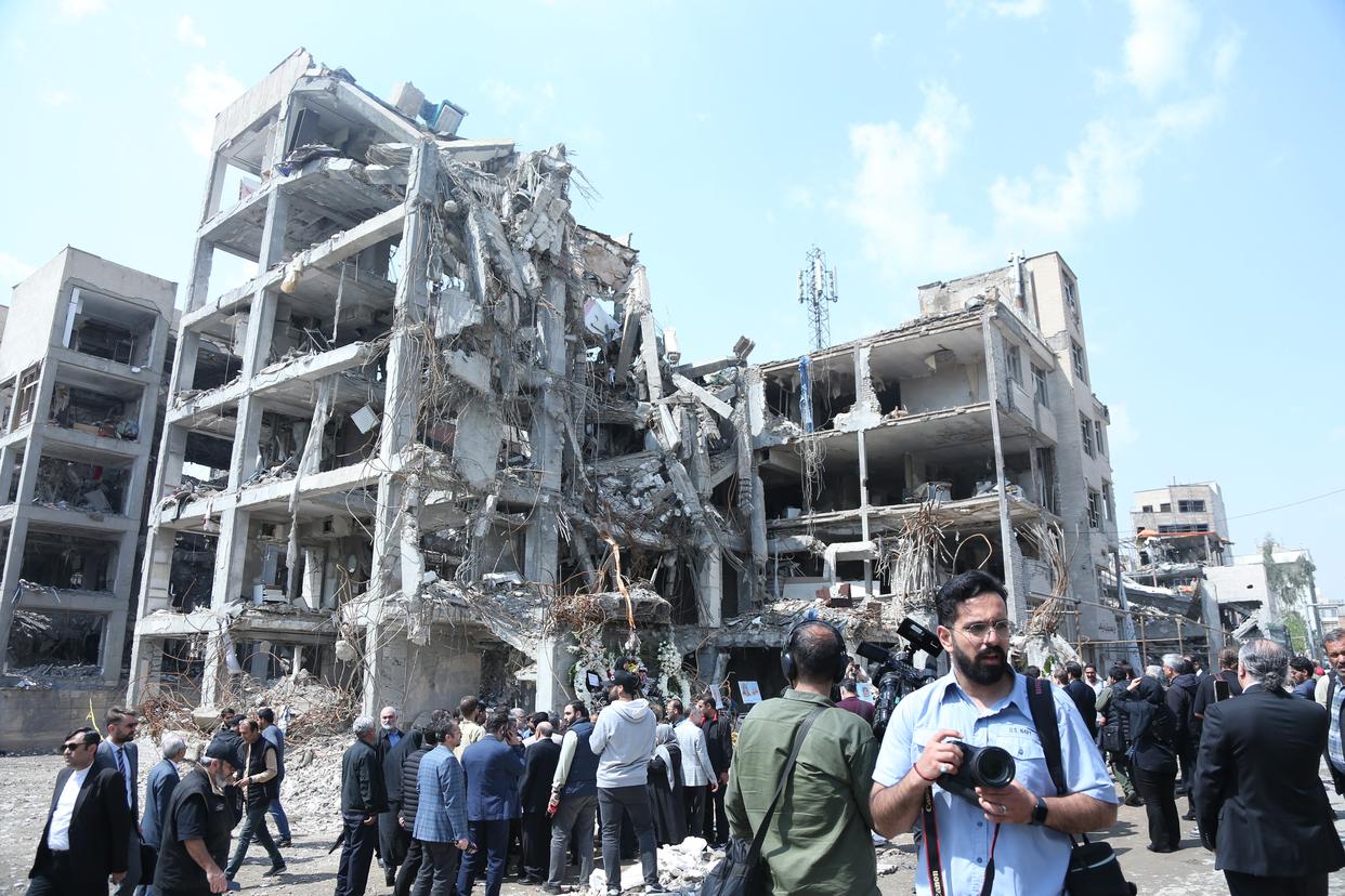 4月20日,在伊朗首都德黑兰,驻伊朗使节和外国媒体查看一处在美以袭击中被损毁的居民区建筑。新华社记者 沙达提 摄