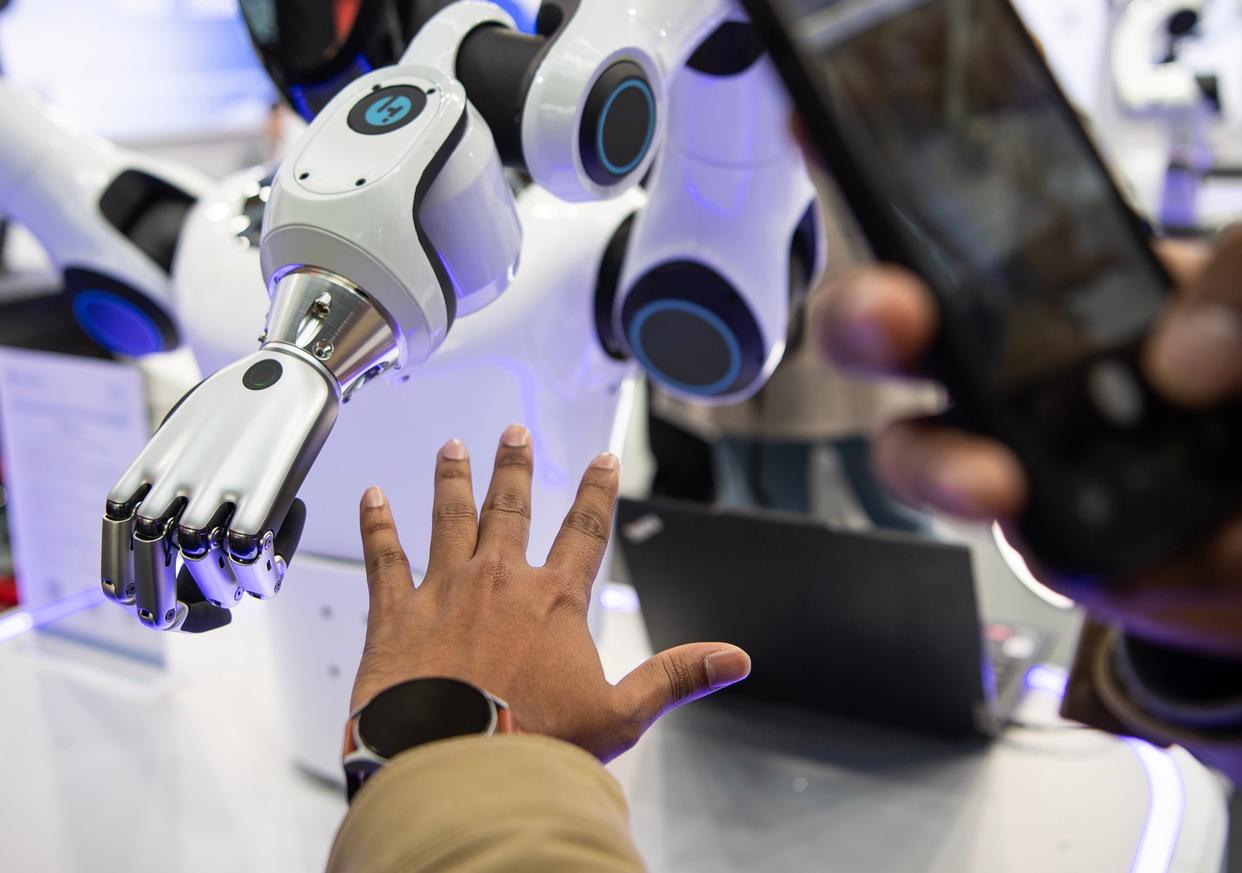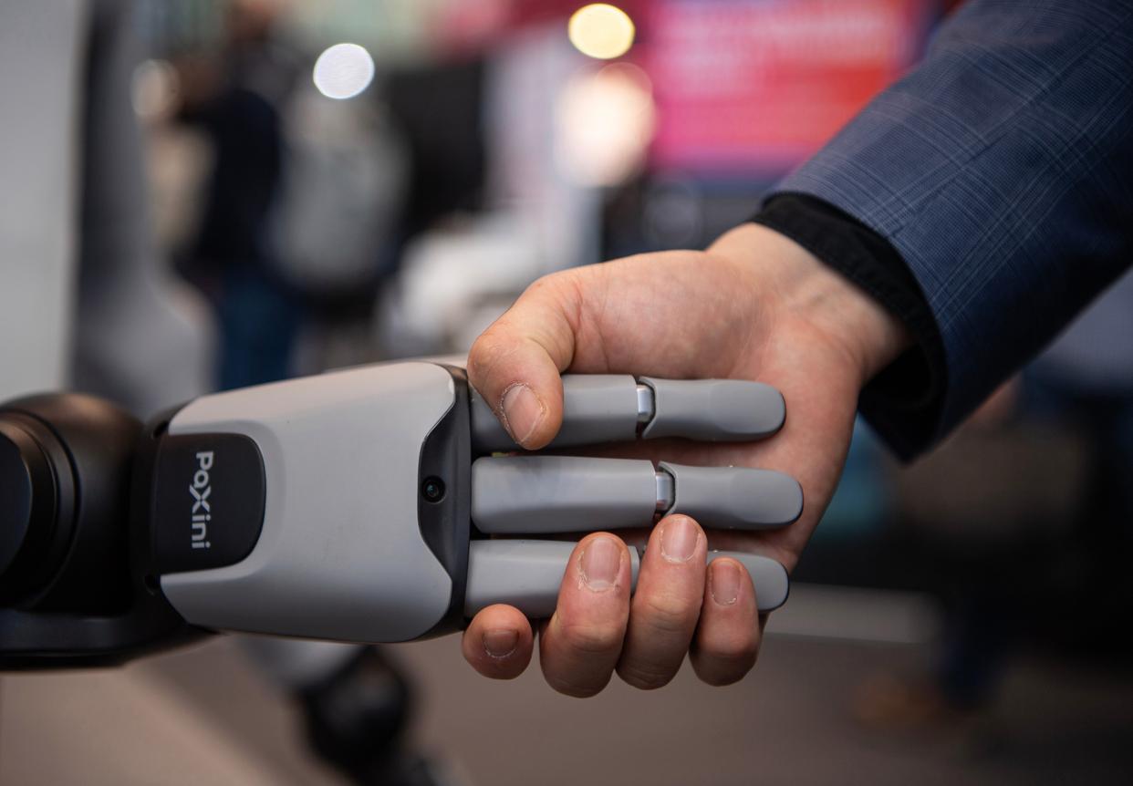 4月21日,在德国汉诺威工业博览会,一名男子与一款帕西尼人形机器人握手。新华社记者 张豪夫 摄