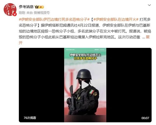 伊朗安全部队在伊朗与巴基斯坦的边境地区开火,打死多名恐怖分子,缴获了大量武器、弹药和爆炸物