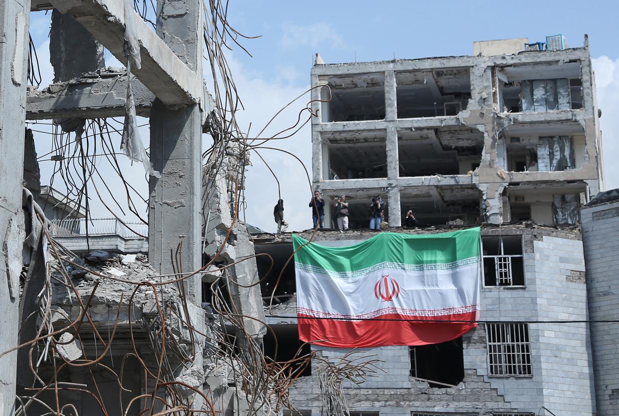 4月20日,在伊朗首都德黑兰,伊朗国旗悬挂在遭美以空袭严重损毁的居民区建筑物上。新华社记者沙达提摄