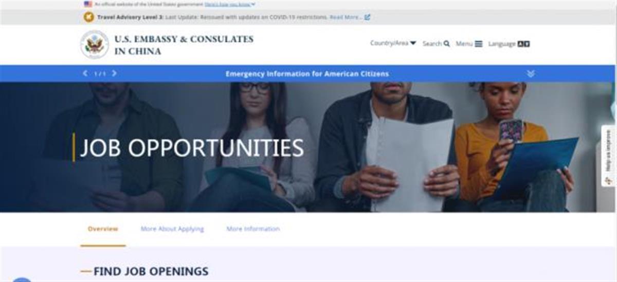 美国驻华大使馆和领事馆网页上有关申请使领馆工作的网页截图(来源:环球时报)
