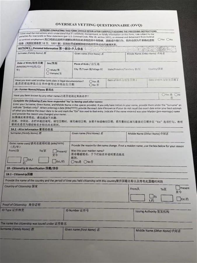 记者获得的一份《海外背景调查问卷》(Overseas Vetting Questionnaire)复印件(来源:环球时报)