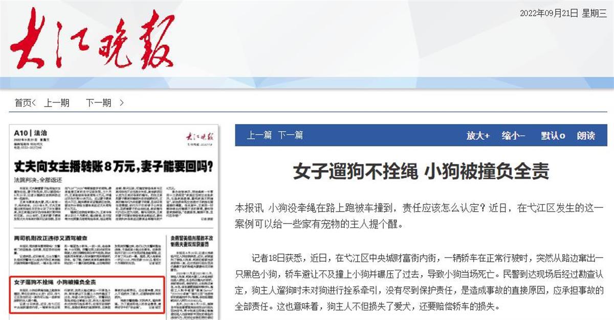记者9月26日从南京市公安局江宁分局交警大队江宁中队获悉,18日,江宁中队接到一起报警,称在江宁区铜井福兴街路段,一辆轿车撞死一只小狗。交警经勘查现场和调阅社会公共视频,判定狗主人遛狗外出未拴绳,需承担事故全部责任。(据9月26日澎湃新闻)