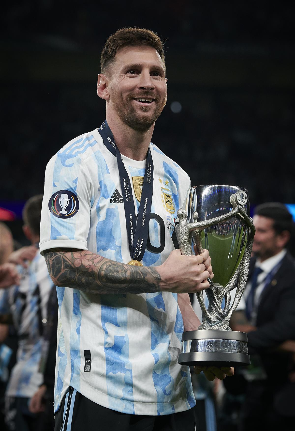 2022年6月2日南美欧洲超级杯,梅西在赛后手持奖杯庆祝。 来源:新华社