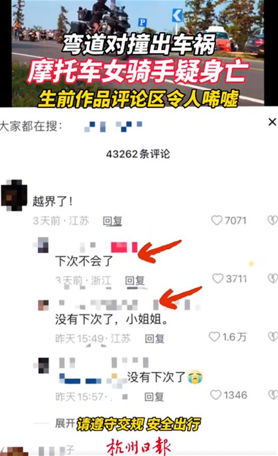 详看了报道,发现这起意外的事故倒也不“意外”。报道中说,她以前骑行视频曝光,曾多次越线行驶,驾驶习惯十分危险。有网友在她的一则视频中留言“越界了!”而她回复,“下次不会了”。两天后,该网友留言说“没有下次了,小姐姐。”后面是一个带着哭的表情。