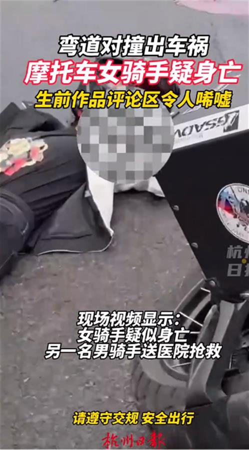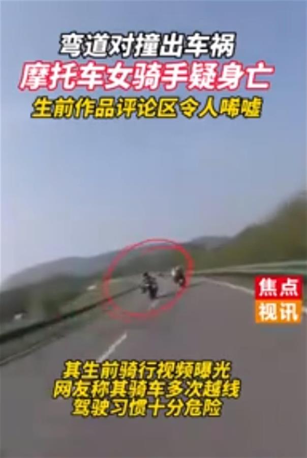10月7日,江苏常州一摩托车女骑手弯道对撞。据现场视频显示,女骑手疑似身亡。该骑手之前骑行视频曝光,网友称其骑车多次越线,驾驶习惯十分危险。(据10月8日杭州日报视频报道)