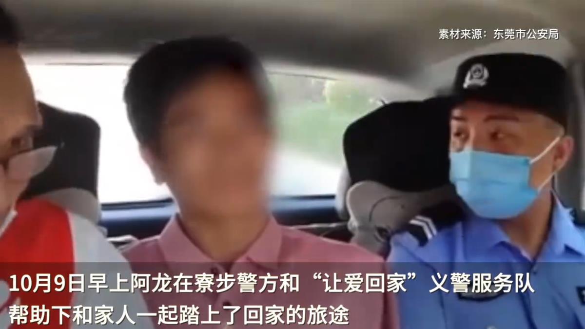 10月6日,东莞寮步警方在盘查时遇到一名流浪汉,经详细询问,得知他叫阿龙,2002年曾考上重点大学,入学后却因沉迷游戏离家出走,自此与家人断绝联系,身份证早已丢失,平时四处流浪靠捡废品为生。10月9日早上,阿龙在寮步警方和“让爱回家”义警服务队帮助下,和家人一起踏上了回家的旅途。(据10月12日长江云)