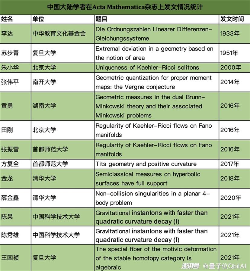 中国学者被Acta Mathematica接收的论文统计 (来源:网络)