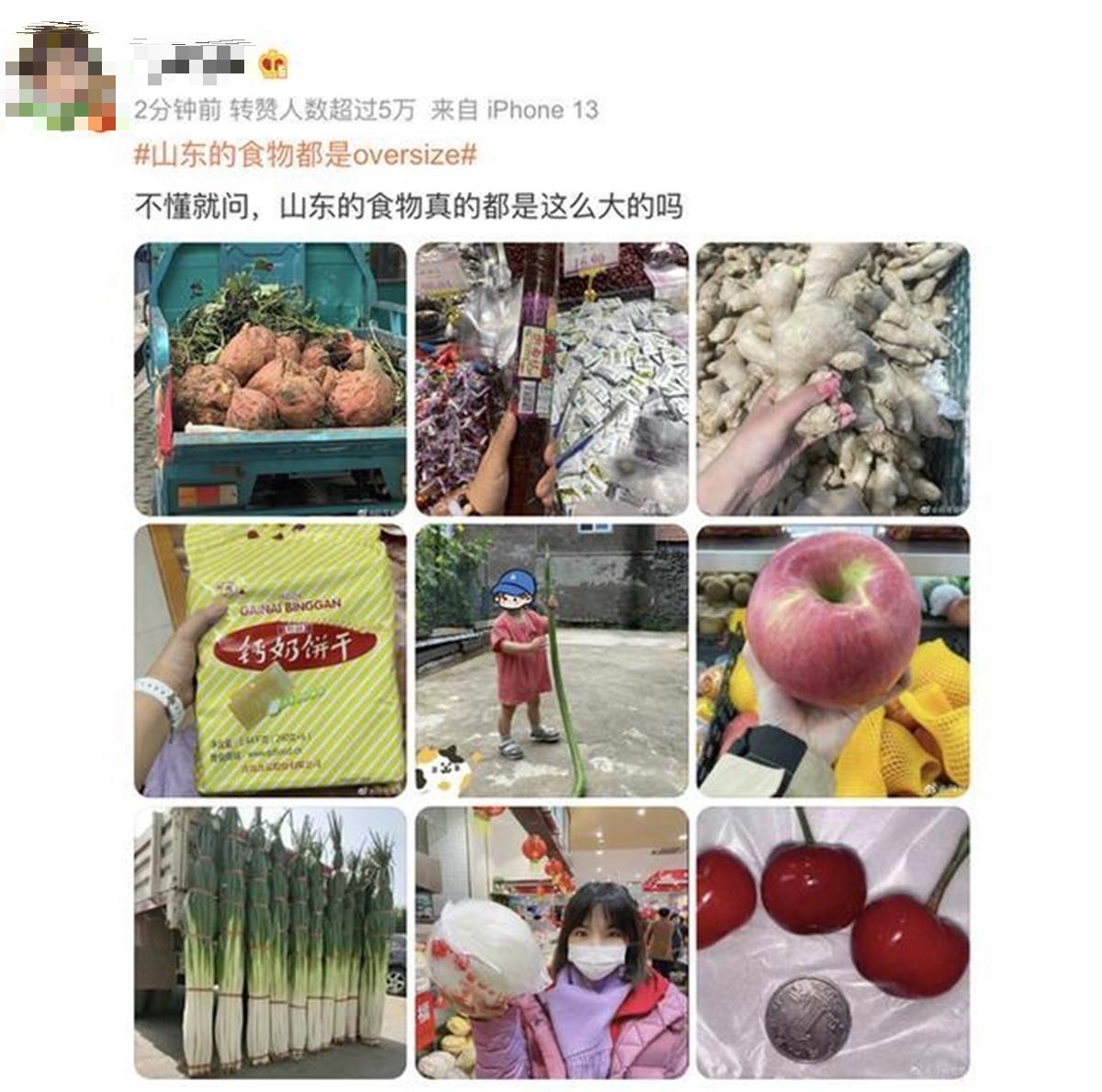 10月16日,山东因为超大号的食物引发热议,上了热搜。事情的起因是,一名女生在山东济宁任城区街头看见超大号食物,当下直接惊呆,“头一回见!这地瓜比我的头都大好几圈!”她将所见所闻拍成视频发到网上后,不少本地人和曾到山东旅游过的网友热心回复:“正常操作,这么大的有的是!”(据10月16日山东商报)