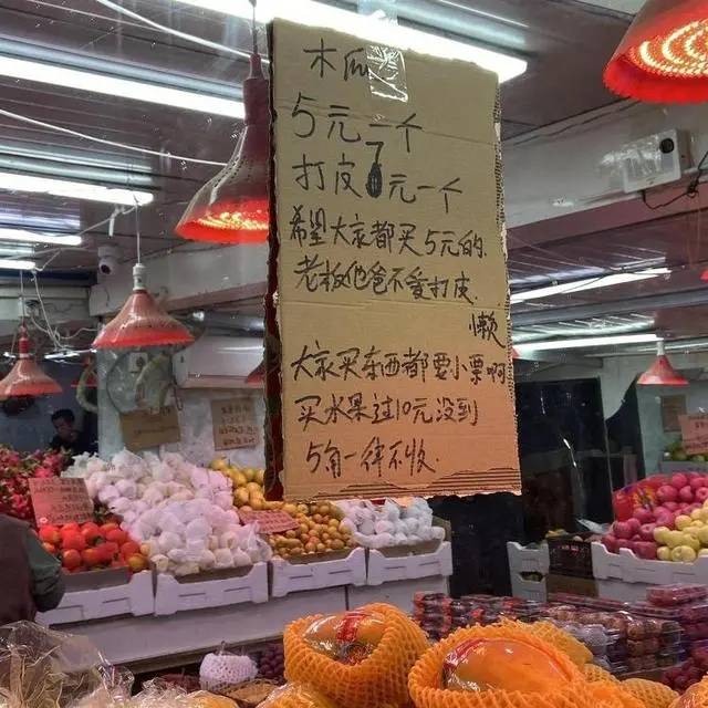 在一切皆可营销的时代,水果店好像也“卷”了起来——“这个小破桃,又脆又甜”“青桔子不好吃,为了配色才卖的,是酸的”“木瓜5元一个,打皮7元一个。希望大家都买5元的,老板的父亲不爱打皮,懒!”以上这些碎碎念式标语,悬挂于辽宁沈阳一高校水果店内。