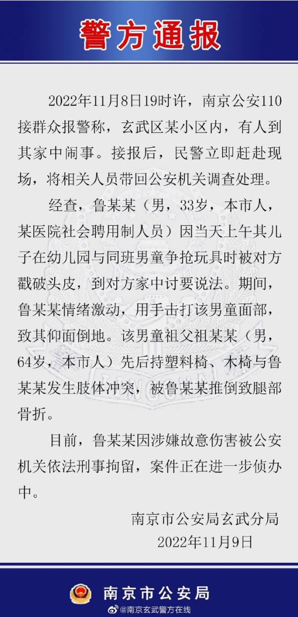 11月9日,南京警方对此案做出通报,鲁某某(男,33岁,某医院社会聘用制人员)因当天上午其儿子在幼儿园与同班男童争抢玩具时被对方戳破头皮,到对方家中讨要说法。期间,鲁某某情绪激动,用手击打该男童面部,致其仰面倒地。该男童祖父祖某某(男,64岁)先后持塑料椅、大椅与鲁某某发生肢体冲突,被鲁某某推倒致腿部骨折。目前,鲁某某因涉嫌故意伤害被公安机关依法刑事拘留,案件正在进一步侦办中。