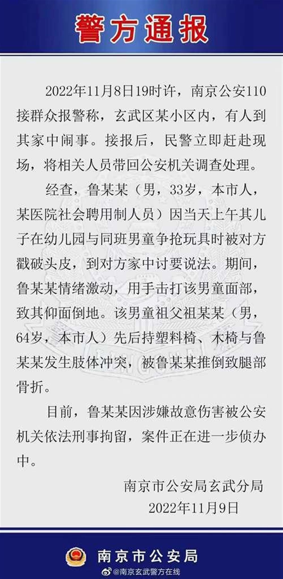 11月9日,一段男子上门掌掴5岁幼儿的视频引发网友强烈关注。随后,警方发布通报,打人者鲁某某因当天上午其儿子在幼儿园与同班男童争抢玩具时被对方戳破头皮,到对方家中讨要说法。期间情绪激动,用手击打该男童面部,致其仰面倒地,推倒该男童祖父祖某某致其骨折。目前,鲁某某因涉嫌故意伤害被公安机关依法刑事拘留,案件正在进一步侦办中。(据11月9日极目新闻)