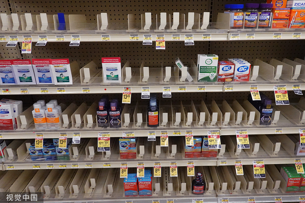 2022年1月13号,芝加哥市一家杂货店和药店,货架上的药品。视觉中国资料图