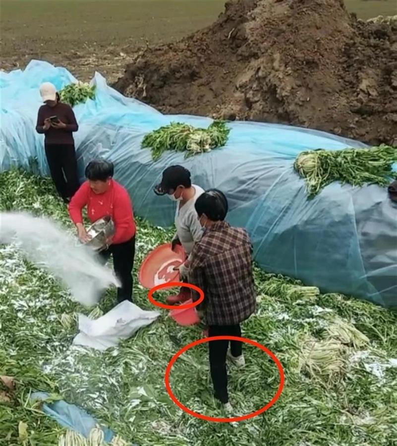 村民直接穿土鞋踩在菜上(图片来源:新京报)