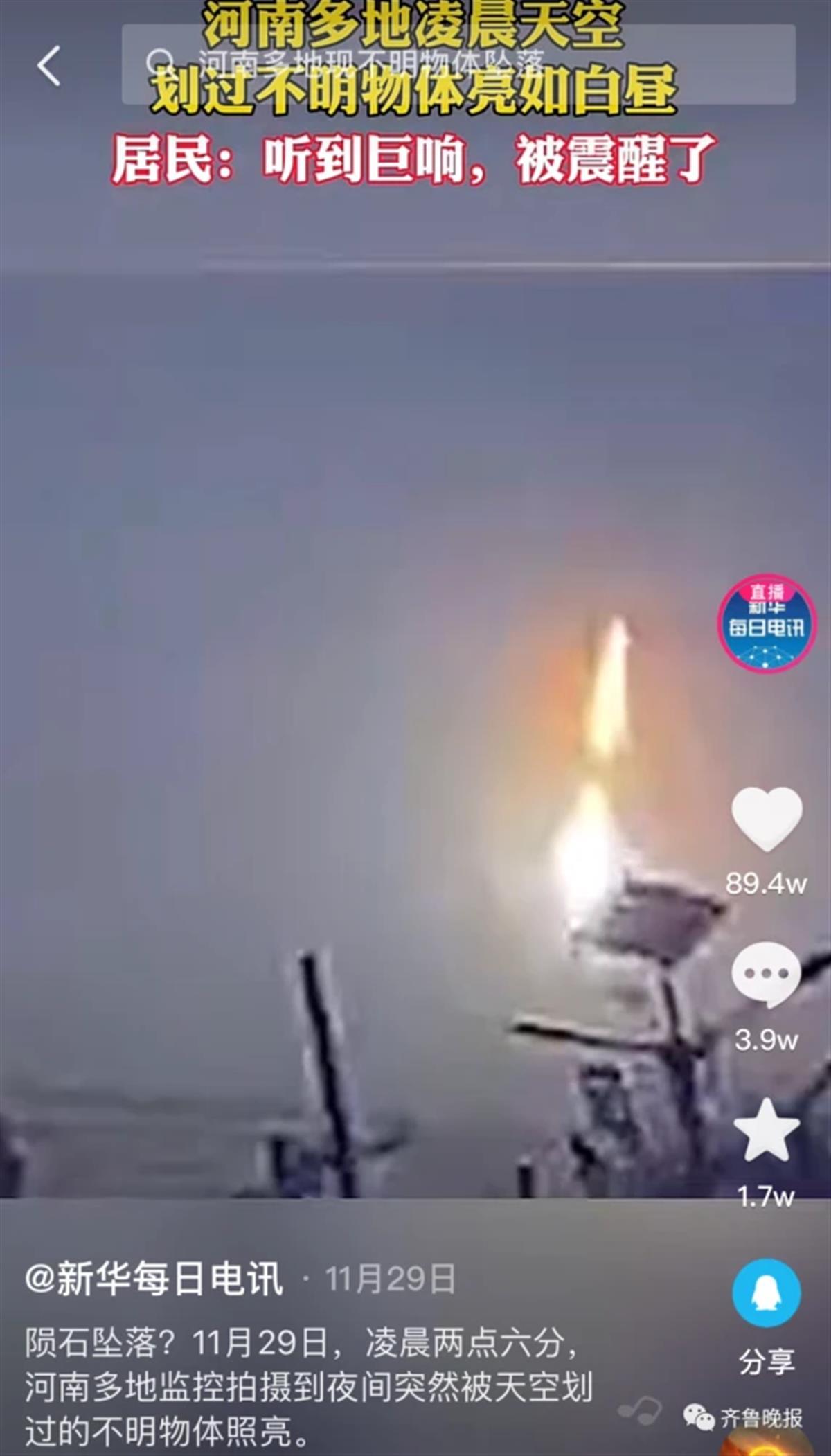 2021年11月29日,火流星划过河南上空(图片来源 新华每日电讯)
