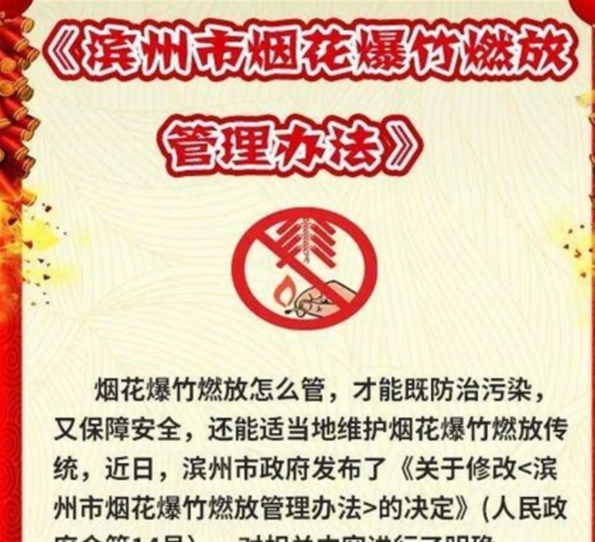 这个办法首先强调的就是环保与安全问题,然后划定了相关禁放区域,一些人员密集场所、重点防火区全年不得燃放烟花爆竹。滨州市同样规定,燃放时应当以保障安全为原则,相关重点区域全年禁止燃放烟花爆竹。
